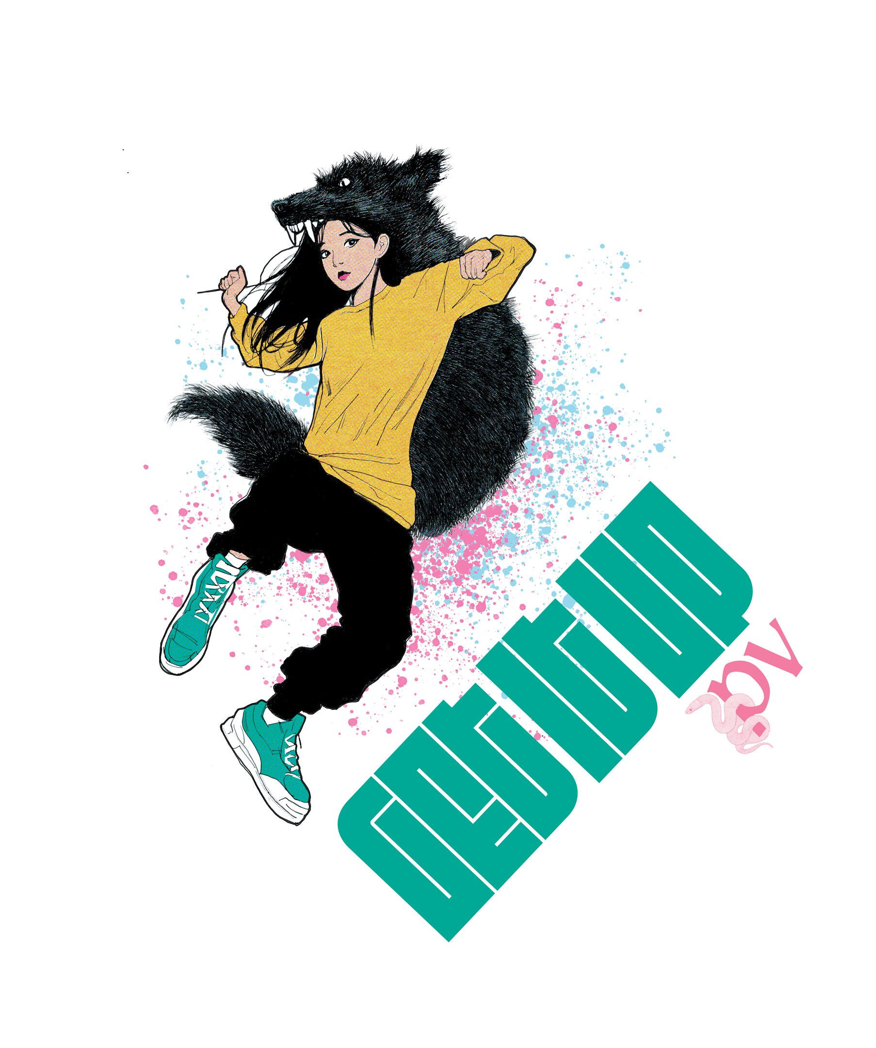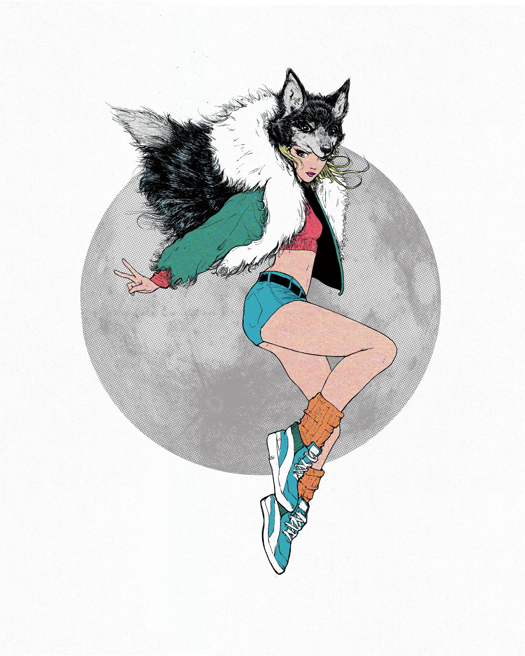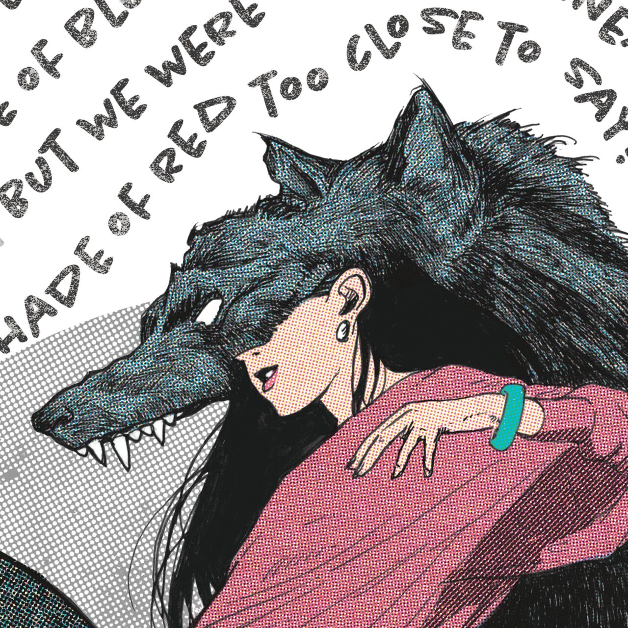 Sneaking wolf pose concept and zine-inspired lyric design. Digital type and color of original ink on Bristol drawing.